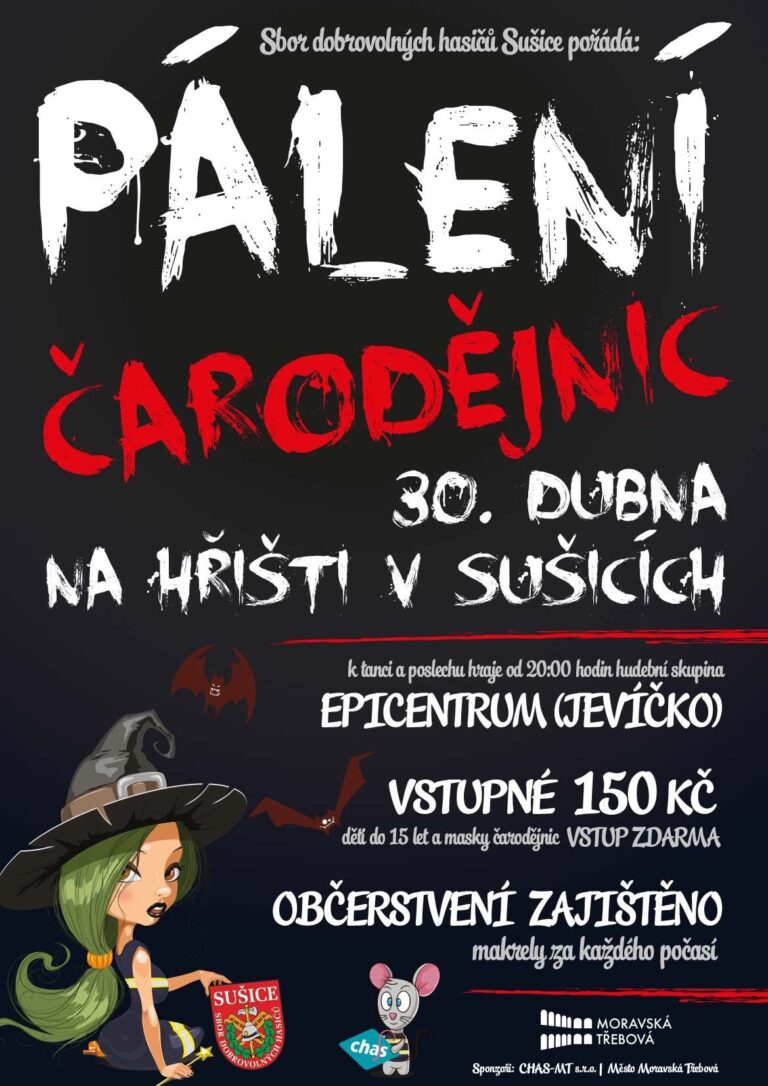 Vstupné 150 Kč, děti do 15 let a masky čarodějnic VSTUP ZDARMA.