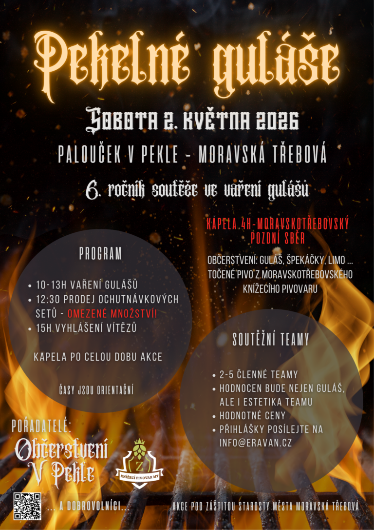 Občerstvení: guláš, špekáčky, limo, točené pivo z Knížecího pivovaru.